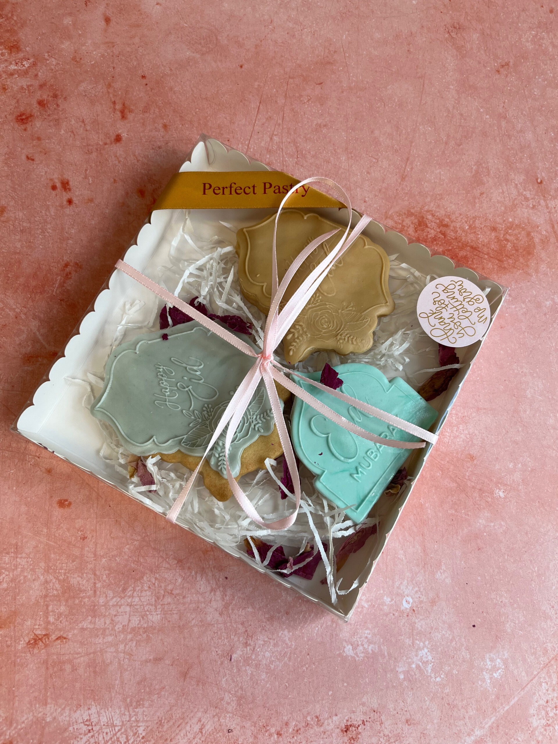 Elk pakket bevat 4 stuks Eid Mubarak koekjes die met de hand zijn gemaakt met de beste ingrediënten om een onvergetelijke smaakervaring te bieden. Elk koekje is voorzien van een prachtige Eid Mubarak boodschap, wat ze extra speciaal maakt.