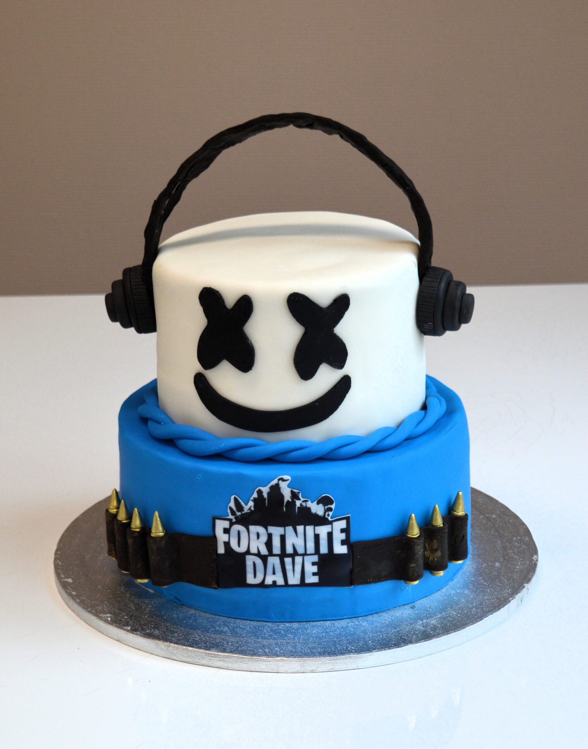 De taart is bedekt met het iconische zwarte Fortnite-symbool aan de voorkant en een levensecht Marshmello-masker gemaakt van fondant.