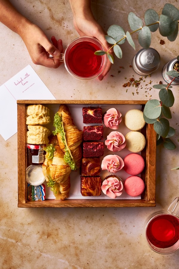 De high tea brunch box is zorgvuldig samengesteld en uiteraard zijn alle gerechten heerlijk vers en handgemaakt. Op het menu staat: scones met jam, boter & clotted cream, croissants/broodjes met rosbief, sla, mayo en parmezanse kaas, 2 mini cupcakes, 2 red velvet cream cheese brownies, 2 macarons en een zakje losse thee.