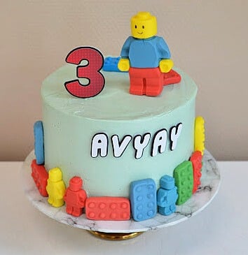 Onze taart is ook met veel zorg voor jullie versierd. We hebben de taart bedekt met een zachte, lichtblauwe botercrème en versierd met kleurrijke fondant blokjes en mannetjes. Als extra touch hebben we een fondant mannetje en de leeftijd van de jarige als topper geplaatst, en natuurlijk voegen we de naam van de jarige toe om de taart echt speciaal te maken voor jullie feest.