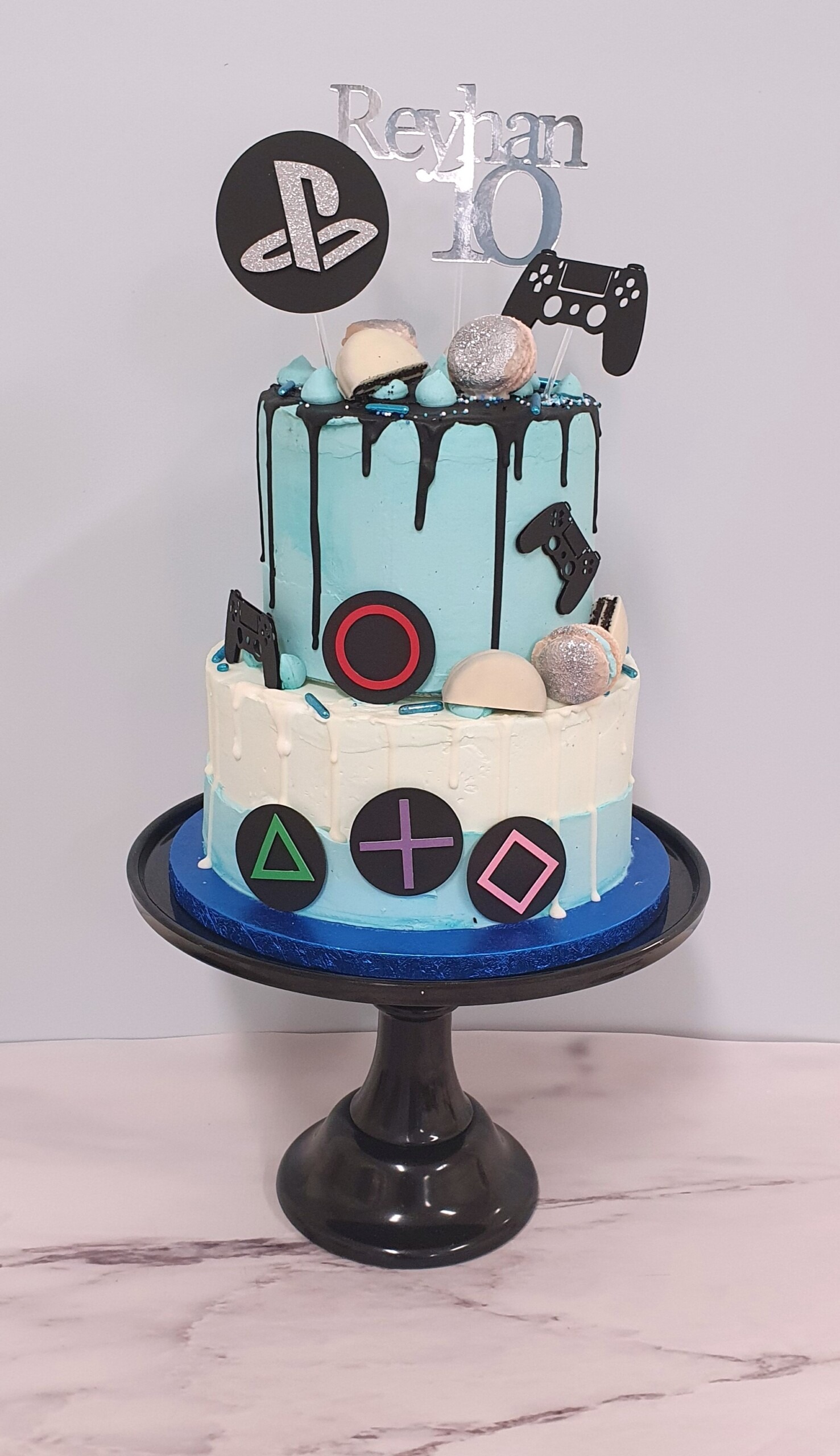 Playstation taart voor een echte gamer verjaardagsfeestje! Kies 1 of 2 laags taart ( afhankelijk van aantal personen) en wij zorgen voor de rest. Leuke topper zijn gemaakt op maat.
