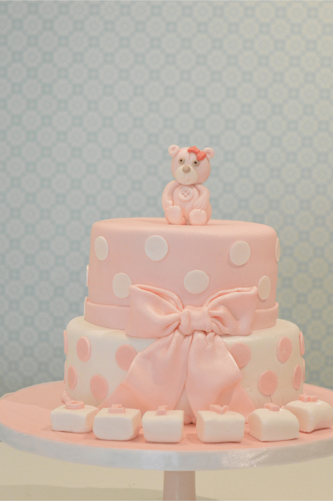 Roze wit stipjes strik beer taart