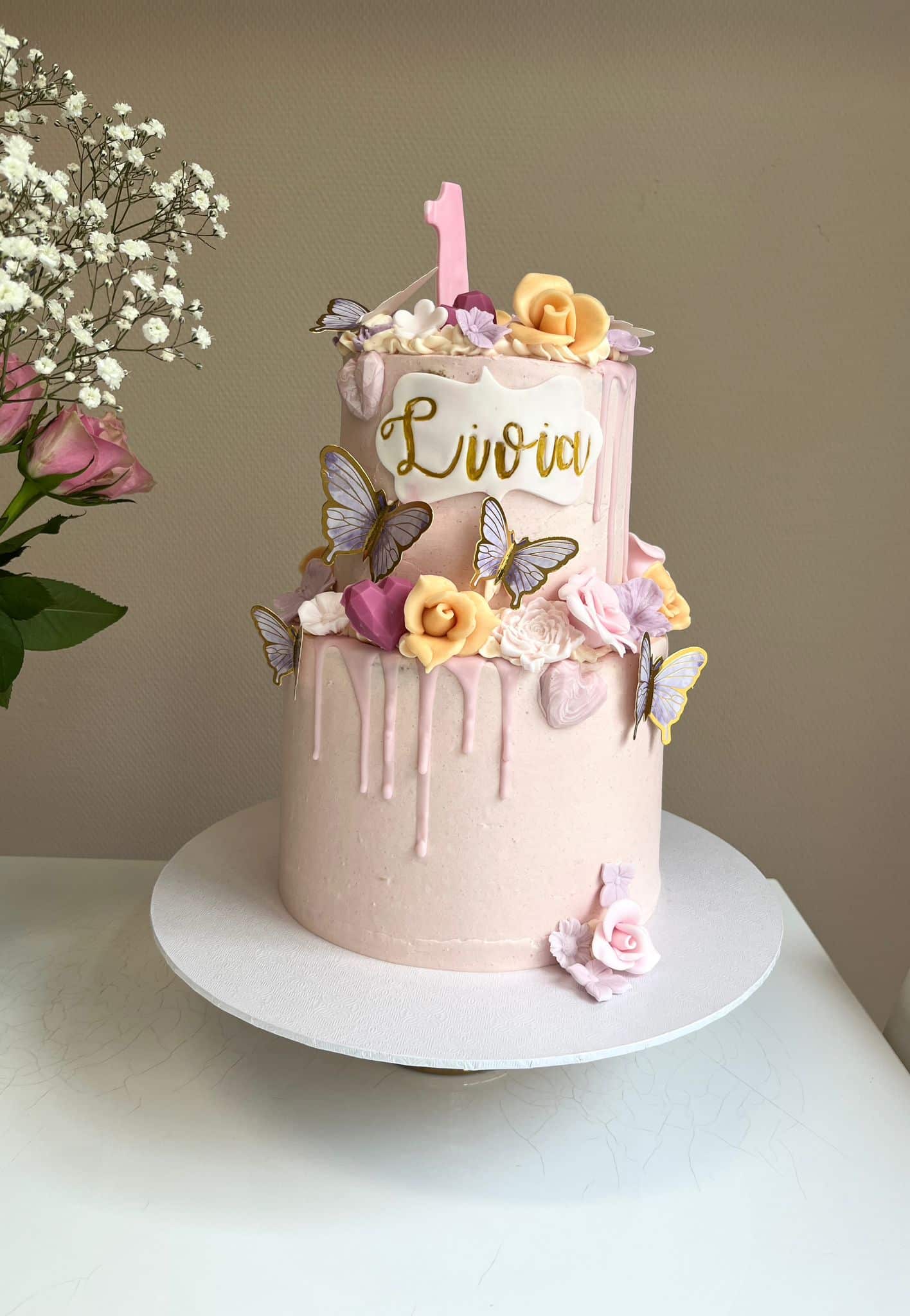Onze prachtige taart zit vol lekkers en prachtige details, zoals schattige vlindertjes, hartjes en bloemen van fondant. De roze botercreme en fondant geven ‘m een feestelijke touch, en het rose drip effect langs de zijkanten voegt elegantie toe. Met een elegante naamplaatje van fondant en gouden letters maak je ‘m helemaal van jou!