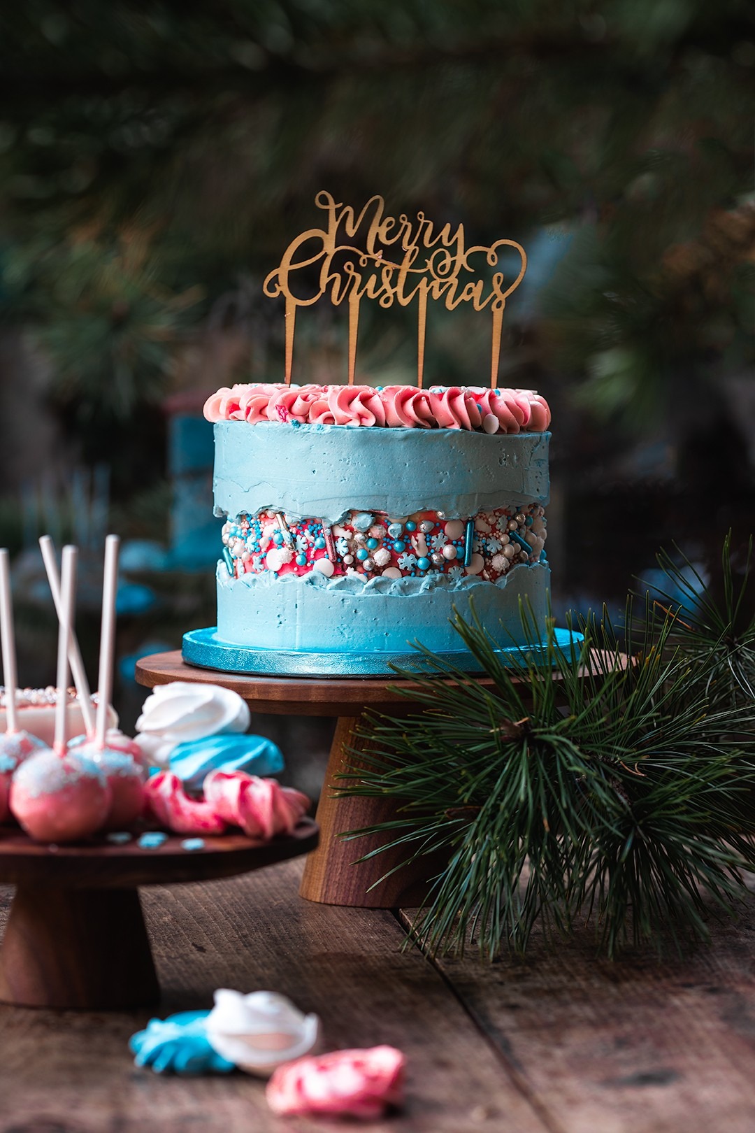 De Fault line kersttaart is een hit die over is gewaaid vanuit Amerika. Je kunt de taart vergelijken met een botercrème cake. Tussen twee ‘foute’ lagen van de botercrème brengen we sprinkels en decoraties aan, zodat de taart er feestelijk uit ziet.